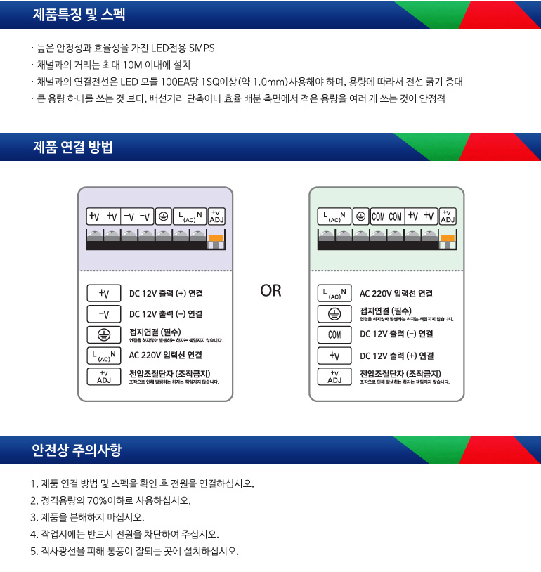 · 채널과의 연결전선은 LED 모듈 100EA당 1SQ이상(약 1.0mm) 사용해야 하며,